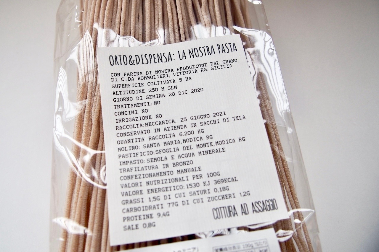小麦は、無農薬、無施肥、一切の灌漑(かんがい:人工的に給水や排水をすること)も行わずに栽培。収穫後、麻袋に入れて保存していた小麦を、必要な量だけモディカにある製粉所に持ち込みセモリナ粉に製粉します。製粉した小麦粉は、彼女が全幅の信頼を置くラグーザ郊外のパスタ工房へ。そこでミネラルウォーターのみを加え、ブロンズ型で成型、じっくりと低温で乾燥させ丁寧に仕上げています。
